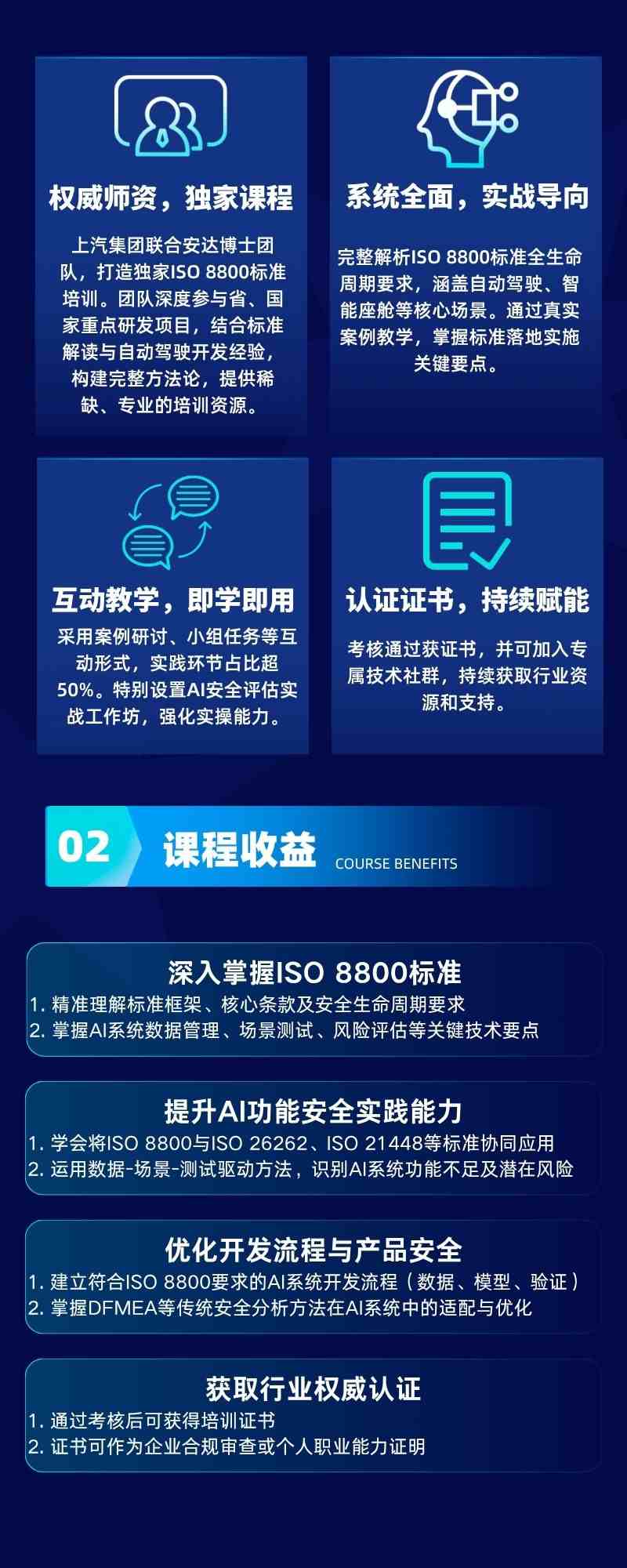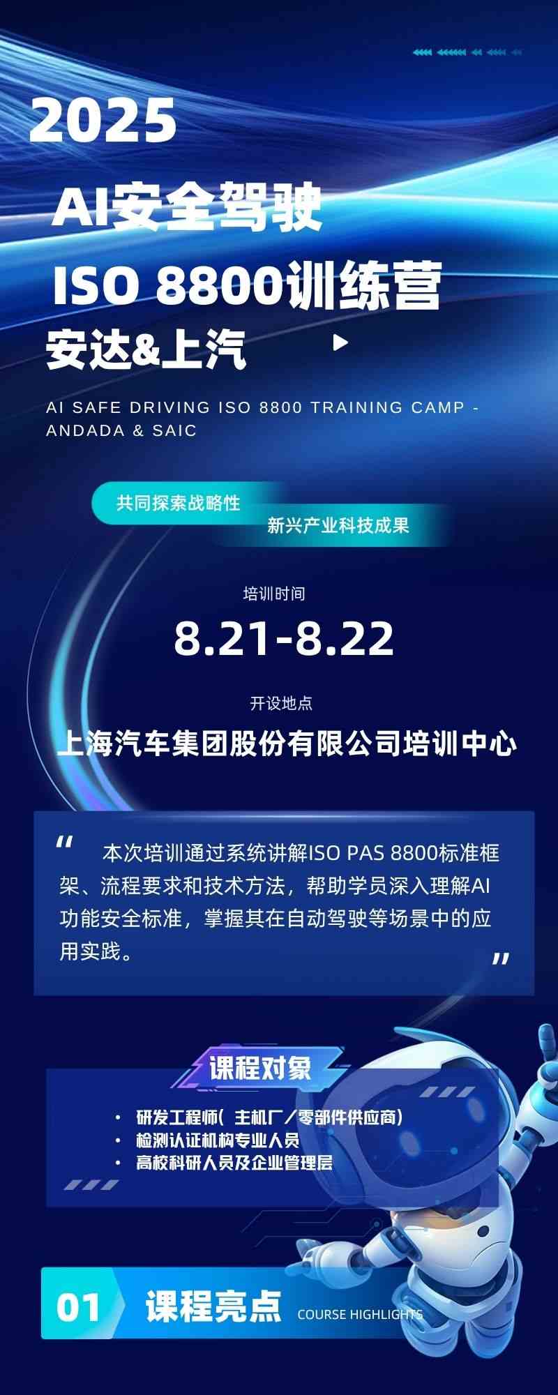 由上海汽车集团与安达博士团队共同打造的ISO 8800标准培训课程将于8月21日至22日在上海开班。本次培训聚焦AI功能安全领域,帮助学员深入理解国际最新标准,掌握自动驾驶安全开发的核心方法。